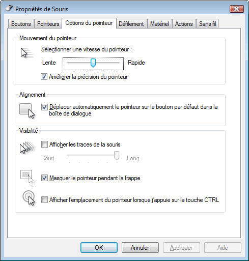 Une option bien pratique (surtout avec un grand écran) : lors de l'affichage d'une boîte de dialogue (Oui, Non, Annuler), le pointeur se place automatiquement sur l'option par défaut.