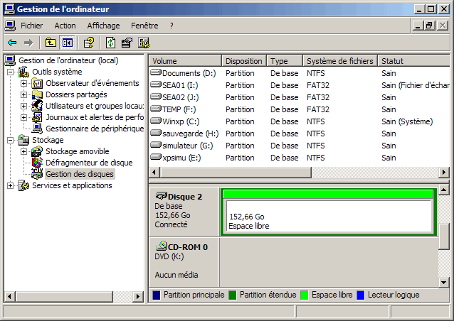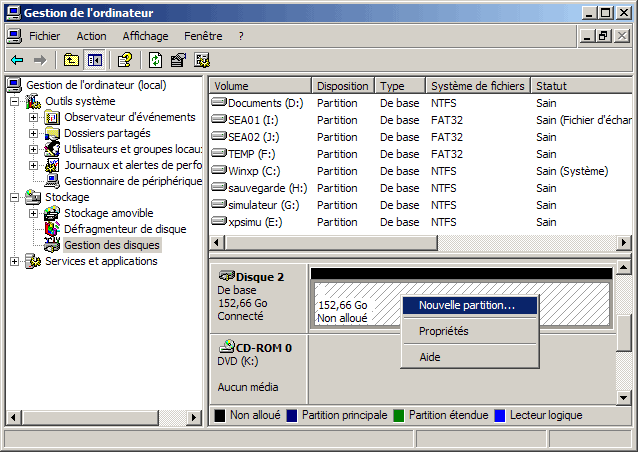 - cliquer avec le bouton droit sur le nouveau disque (espace hachuré)