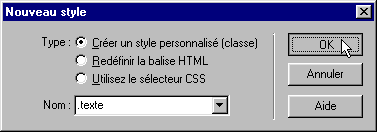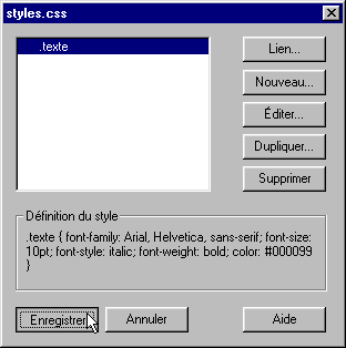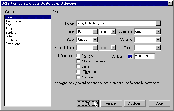 Dans la fenêtre "Définition du style pour .texte dans style.css" :