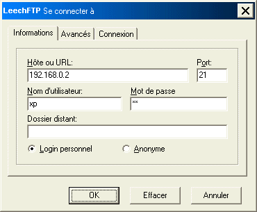 - installer un client FTP sur le PC : LeechFTP (ou autre)