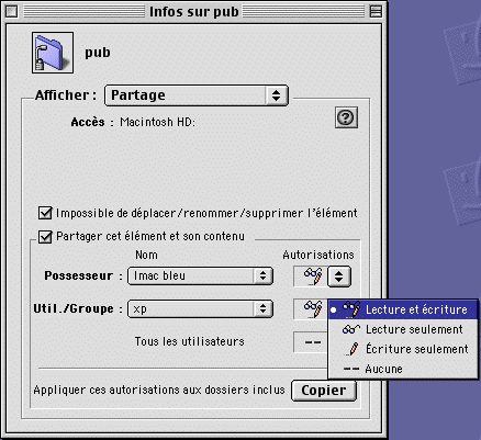 - menu Pomme, Tableaux de bord, Partage de fichiers,