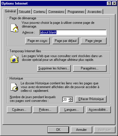 L'onglet Général concerne la page de démarrage, le cache Internet et l'Historique.