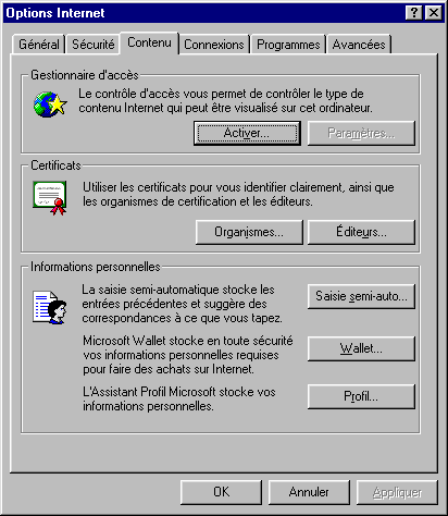 L'onglet Contenu concerne essentiellement la restriction d'accès à certains sites, les connexions sécurisées, ainsi que les informations personnelles concernant la navigation (sites web visités, formulaires, mot de passe).