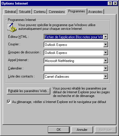 Permet de définir les programmes associés à Internet Explorer (logiciel de mail, Carnet d'adresses, etc.).