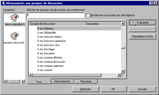 Dans la fenêtre Abonnement aux groupes de discussion :