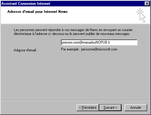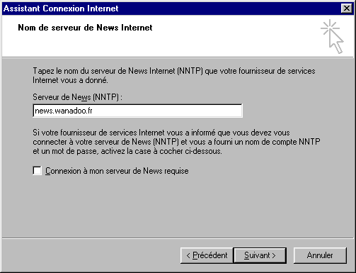 - dans serveur de News, mettre : news.wanadoo.fr (écran 4),