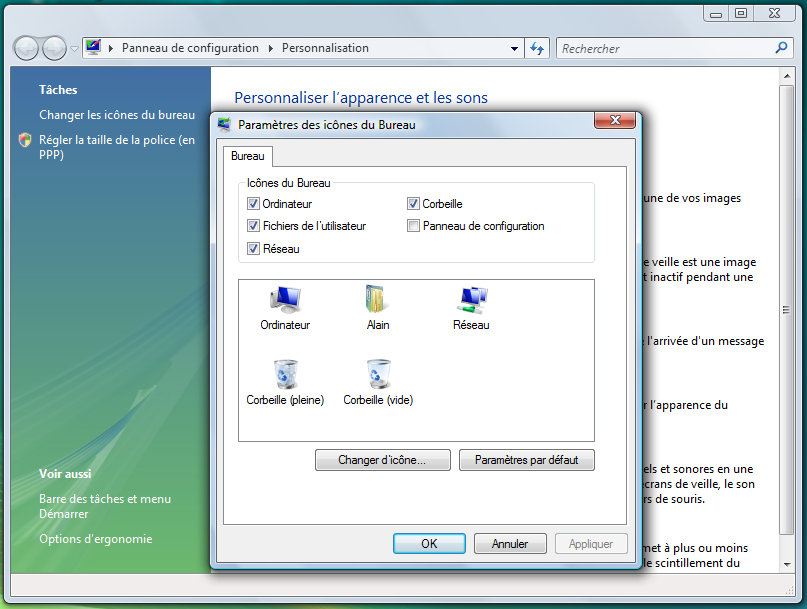 - cliquer sur "Changer les icônes du Bureau"