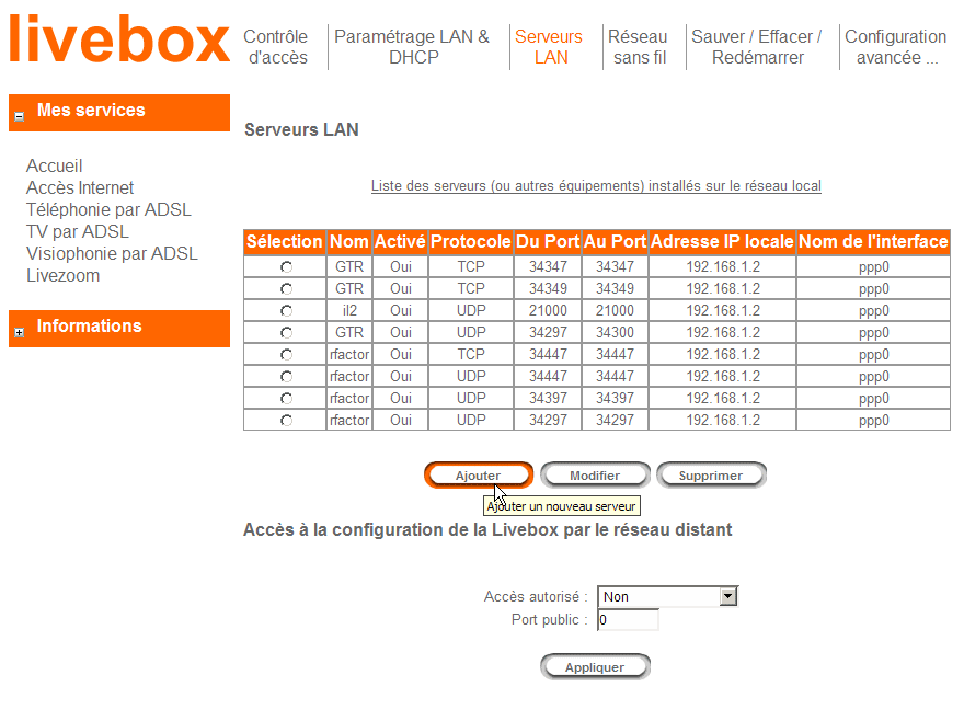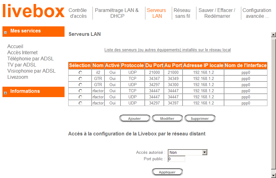 Pour le jeu en réseau, l'utilisation d'un logiciel de P2P, etc. il faudra ajouter un serveur ou rediriger des ports sur la Livebox.