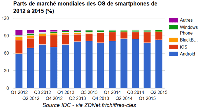 "Au niveau mondial, au 2e trimestre 2015, Android équipait 82,8% des smartphones livrés (-2 points sur un an). Car iOS monte en puissance (13,9%) grâce à l'iPhone 6. Faute désormais de rival (BlackBerry OS est à 0,3%), Windows Phone assure sa 3e place (2,6%), mais stagne."