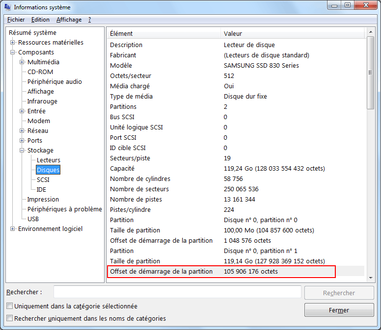 - prendre la valeur du champ : Offset de démarrage de la partition, et vérifier s'il est divisible par 4096