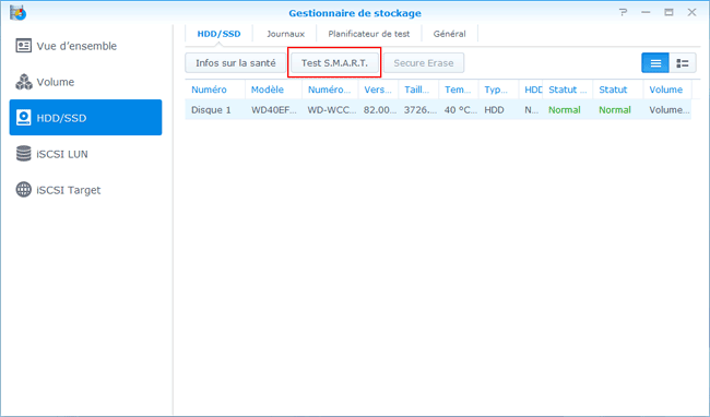 Dans la partie HDD/SSD on a accès au Test S.M.A.R.T :