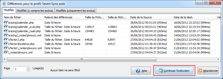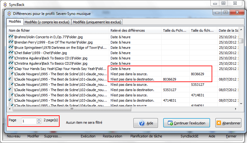 Dans cette fenêtre, Syncback affiche les fichiers qui ont été modifiés (les fichiers qui sont différents dans la source et dans la destination).
