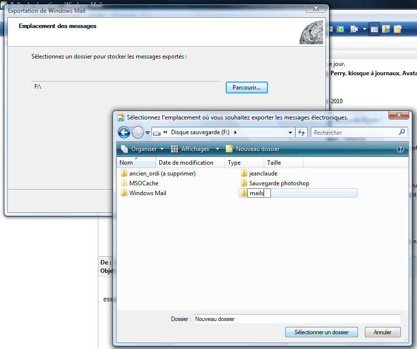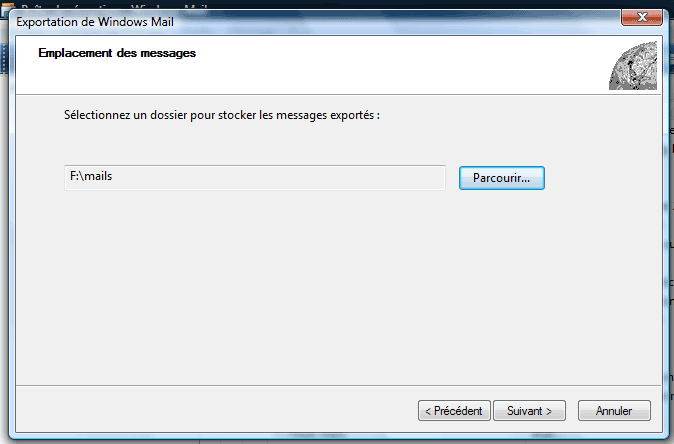 - cliquer sur "Parcourir" pour sélectionner un dossier où sauvegarder les messages