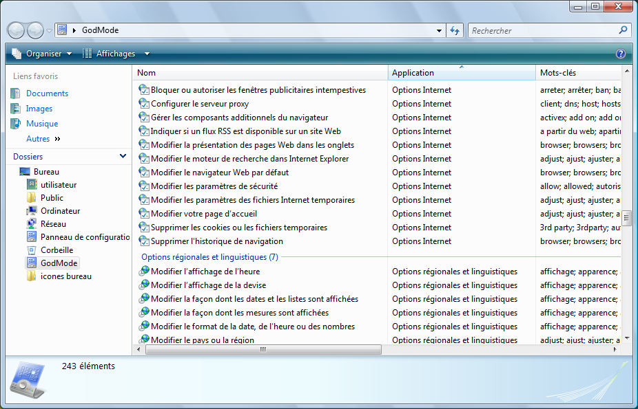 Tom's Hardware indique un "Mode Dieu" dans la nouvelle : "Le nouveau mode Dieu de Windows 7". Attention, c'est pour 7, cela semble planter Vista, au moins en x64...