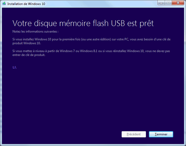 Si on a choisi de créer un support sur clé USB, après la création :